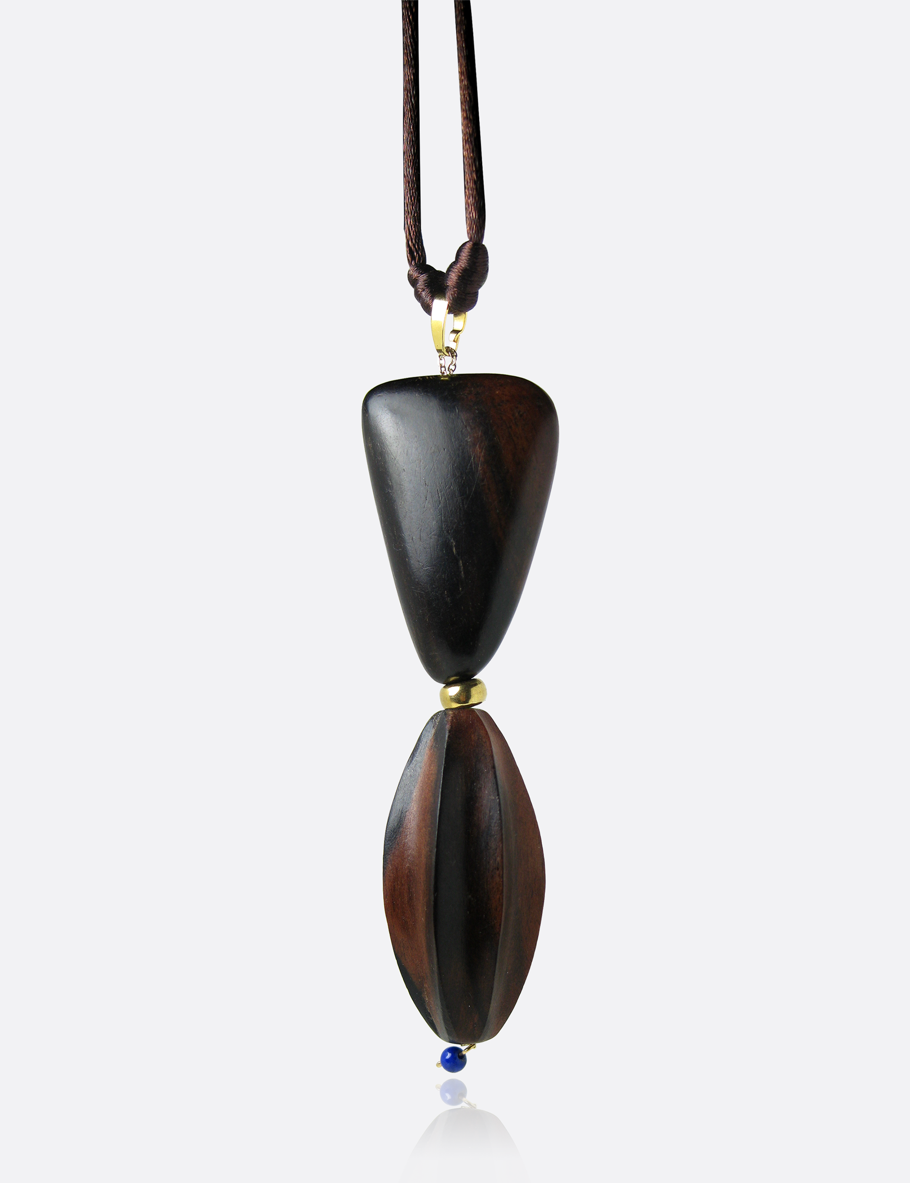Colgante largo de cordón ajustable con dos piezas de madera y bolita de lapislázuli.