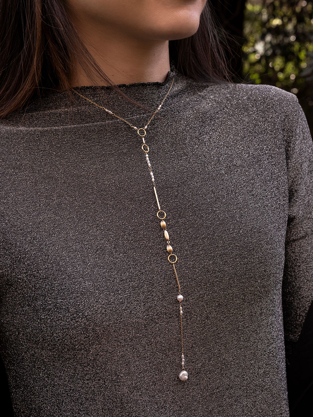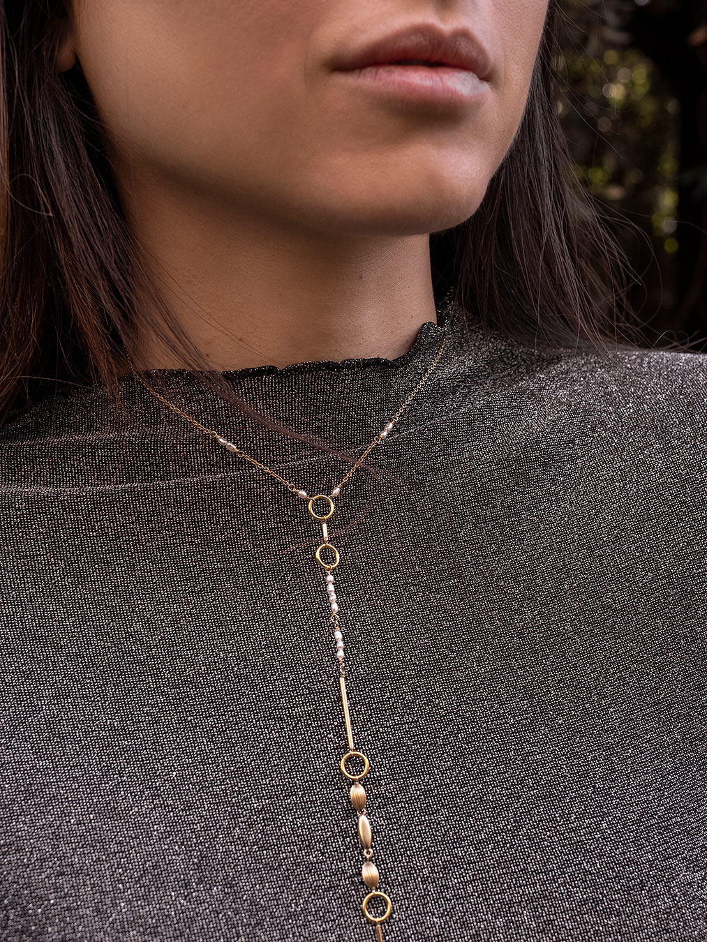 Corbatero de gold filled (laminado de oro amarillo de 14k) y perlas de río. Ideal para ponérselo tipo gargantilla y que el colgante caiga, estilizando la silueta.