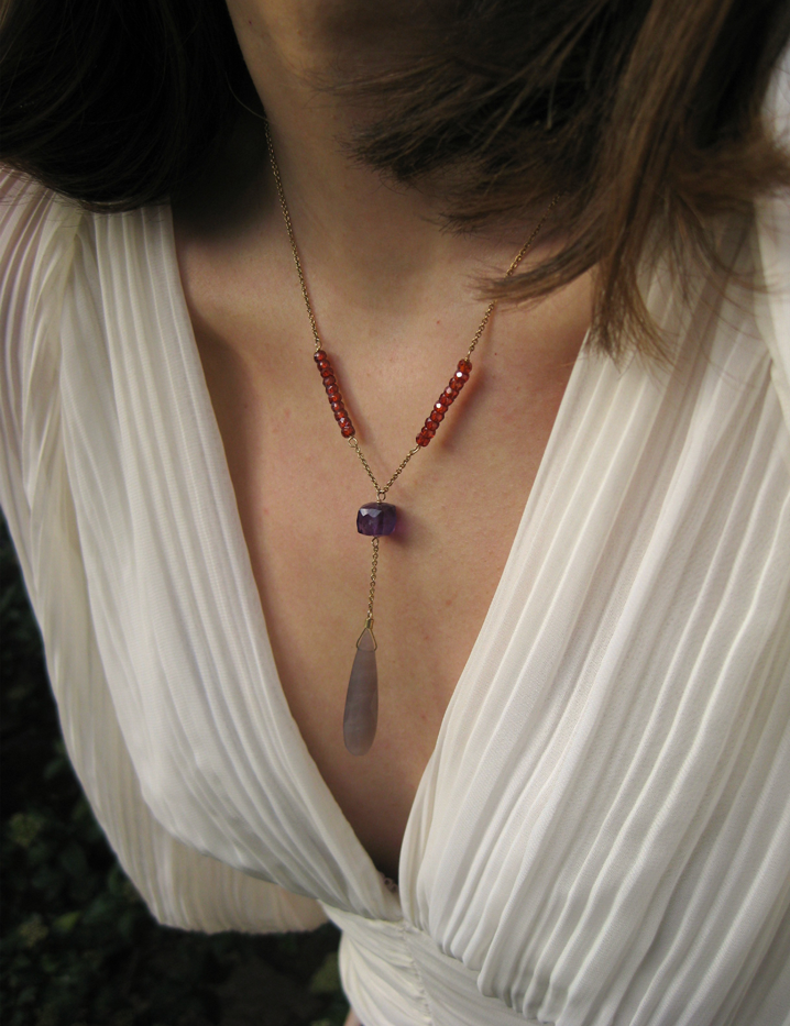 Gemas: Circonitas rojas, amatista y piedra luna.