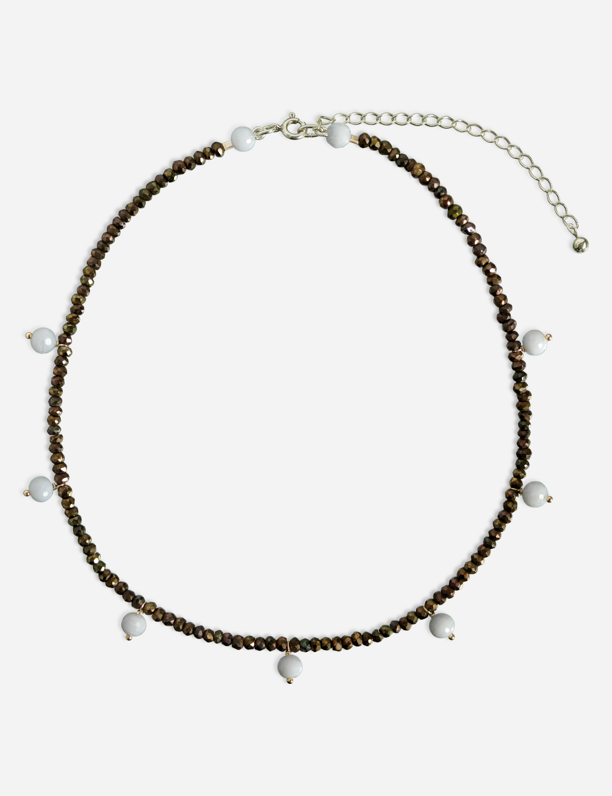 Collar montado en plata de ley con espinelas de color marrón facetadas y bolas azules de calcedonia facetada.