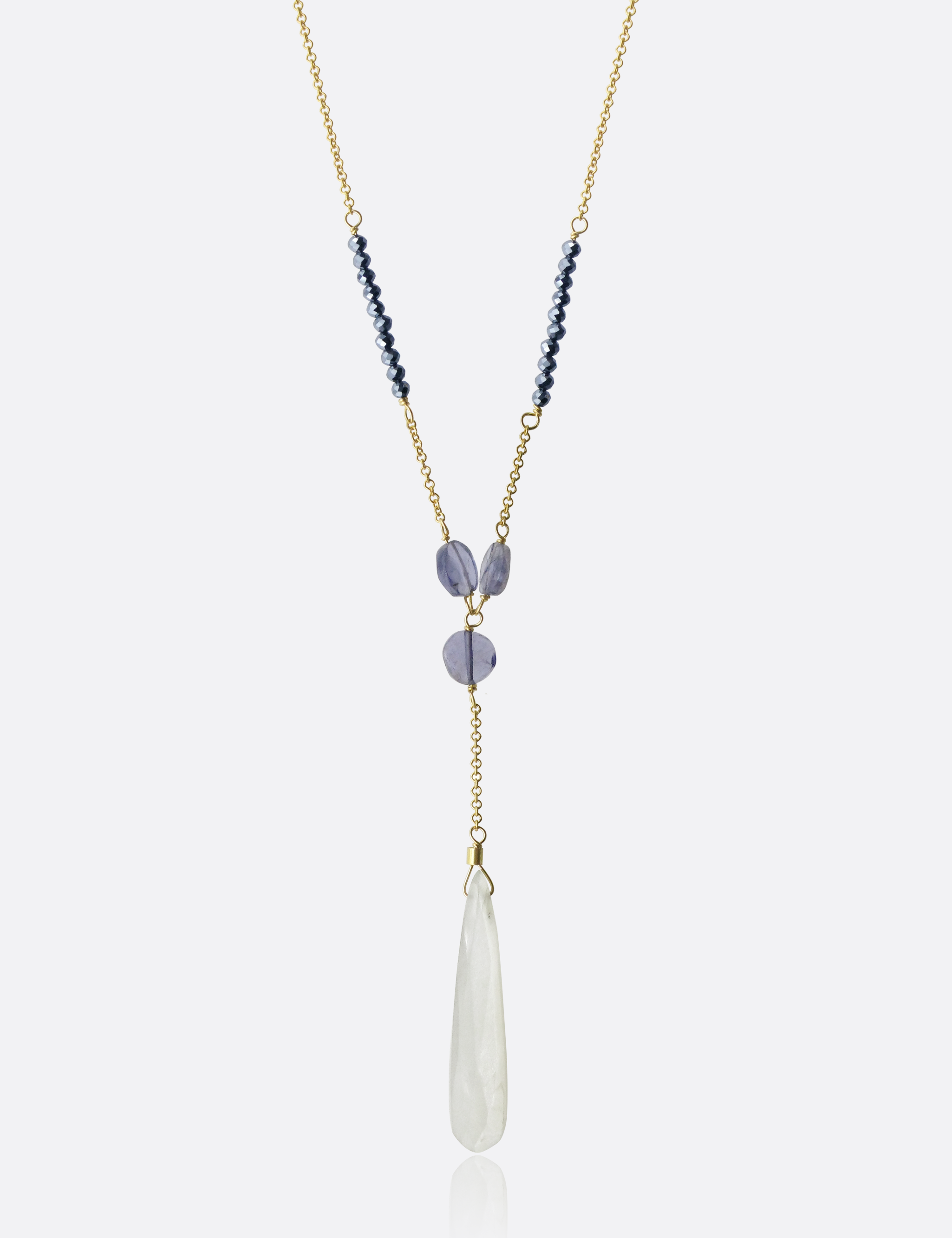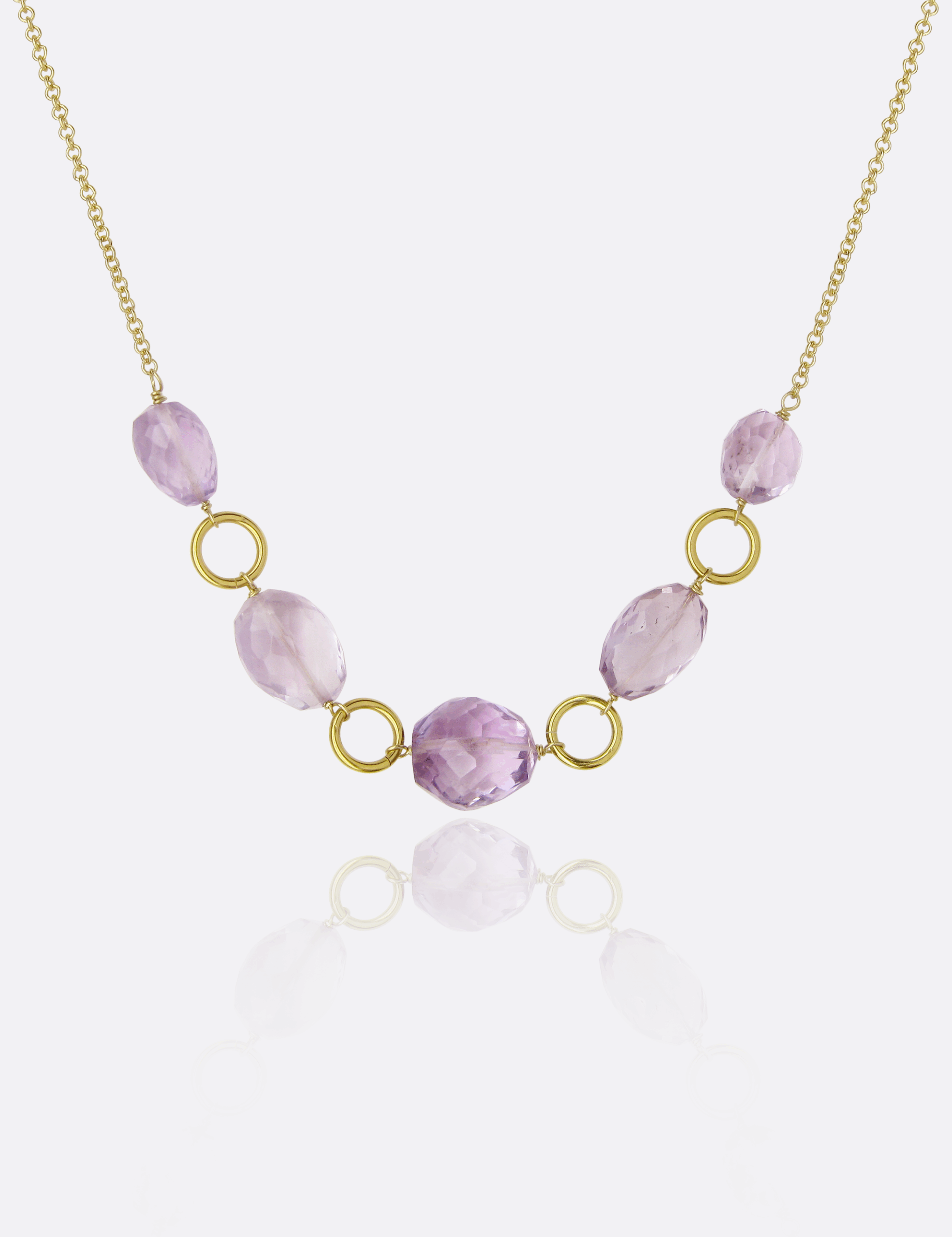 Collar corto de gold filled (laminado de oro amarillo de 14k) y amatistas facetadas. Para ponértelo con vaqueros y camiseta o para la próxima celebración que tengas. Súper versátil.