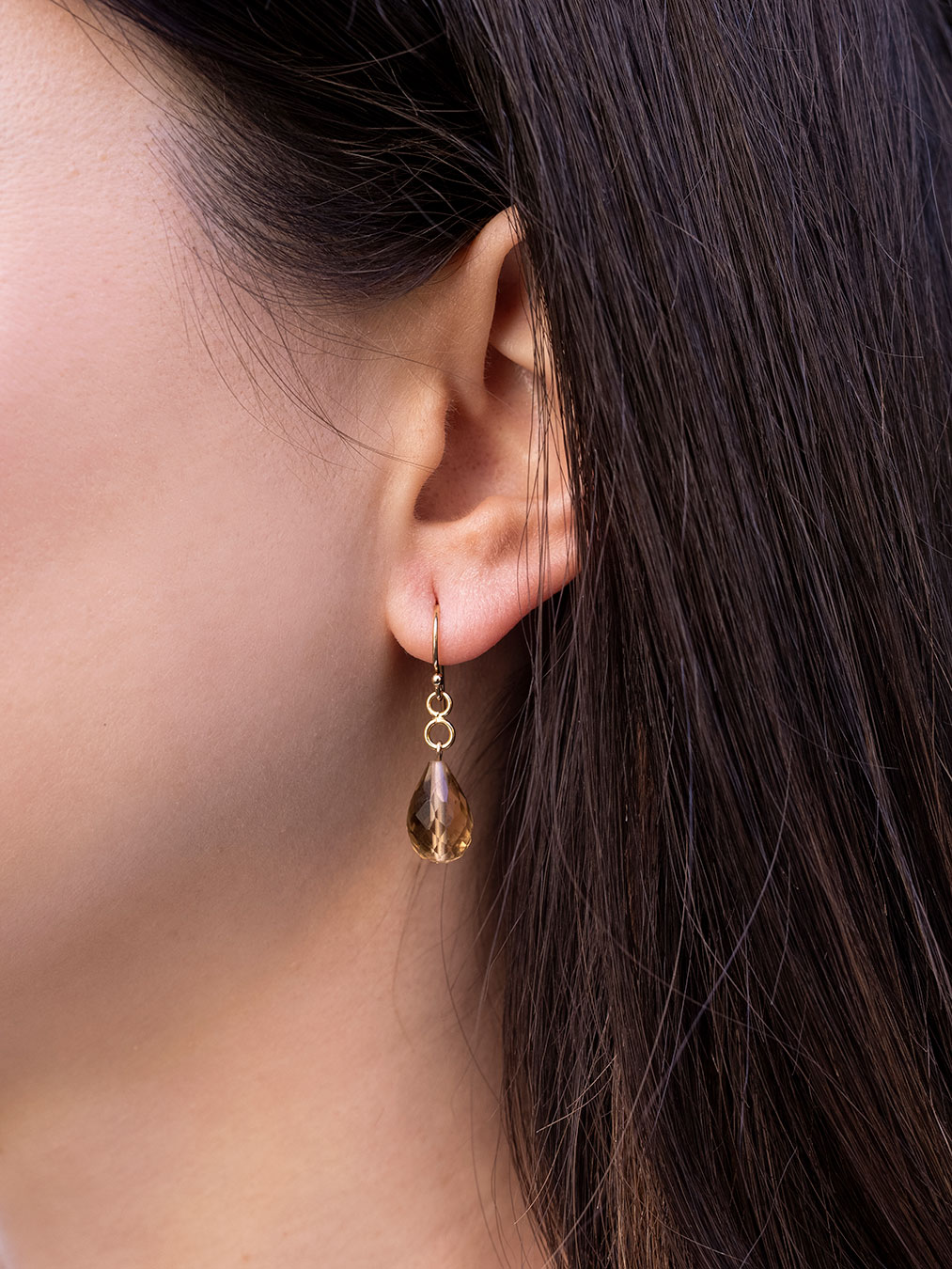 Pendientes montados en laminado de oro amarillo de 14k (gold filled 14/20) con cierre de gancho (incluye tuerca de silicona) y gotas facetadas de cuarzo limón.