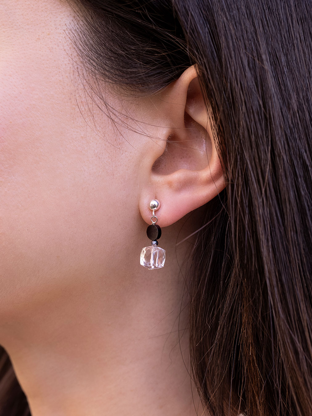 Pendientes montados en plata de ley 925 con cierre de tuerca clásico, disco de espinela, bolita facetada de terahertz y cubo facetado de cristal de roca.