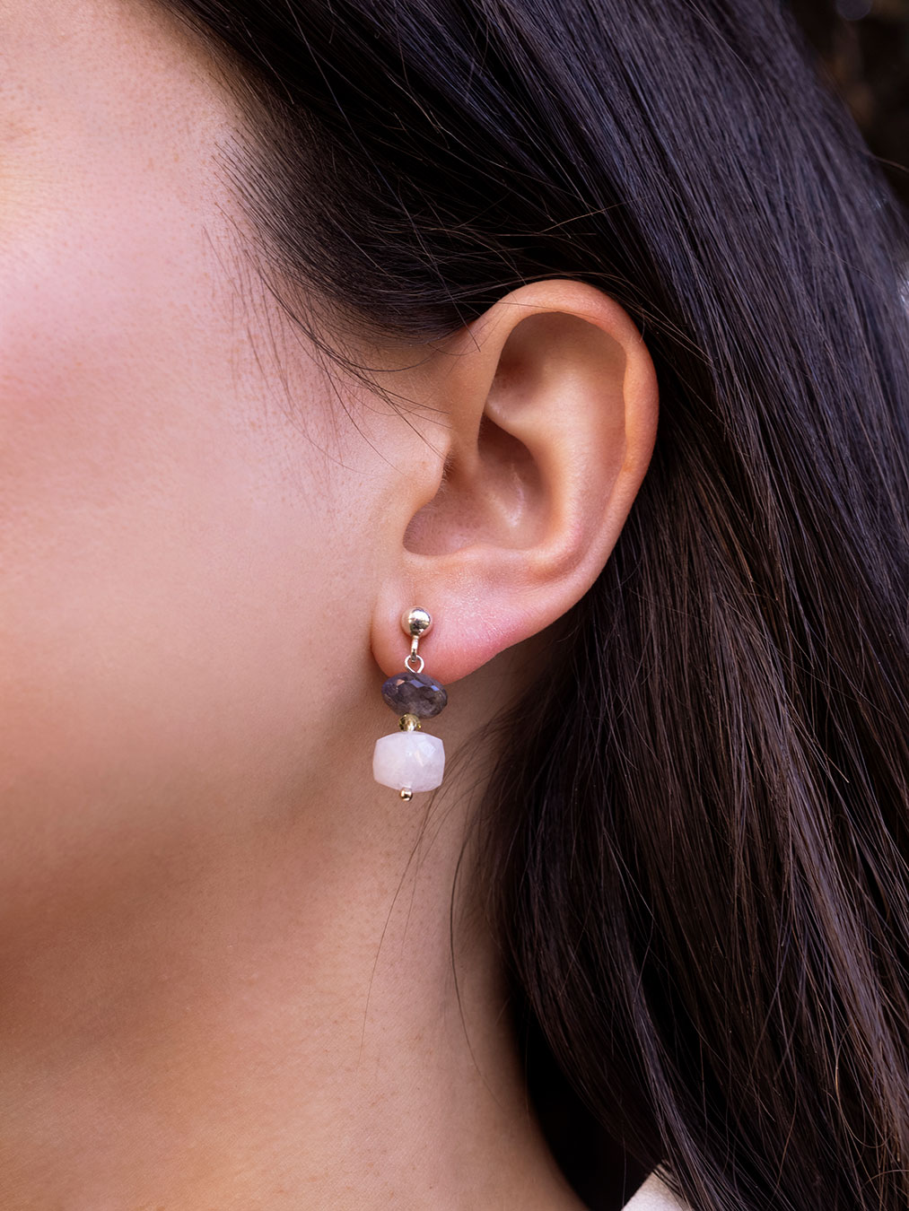 Pendientes montados en plata de ley 925 con cierre de tuerca clásico, donut de labradorita, peridoto y cubo de piedra luna.